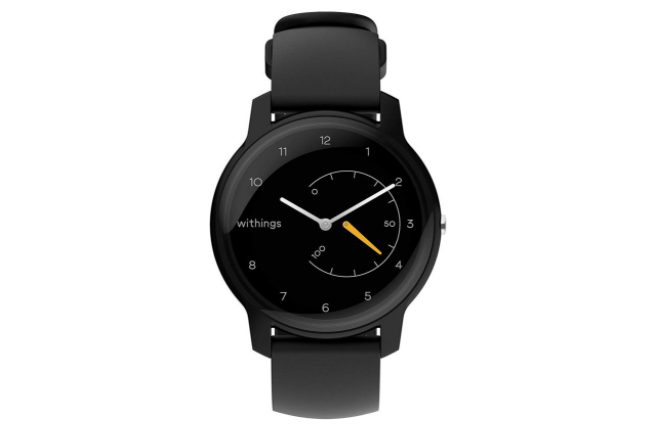 워딩스의 시계형 스마트워치입니다. 기존의 아날로그 시계와 거의 동일한 디자인에 걷기와 달리기 등의 활동을 추적합니다. 시계 오른쪽의 노란색 다이얼 바늘로 확인할 수 있습니다.