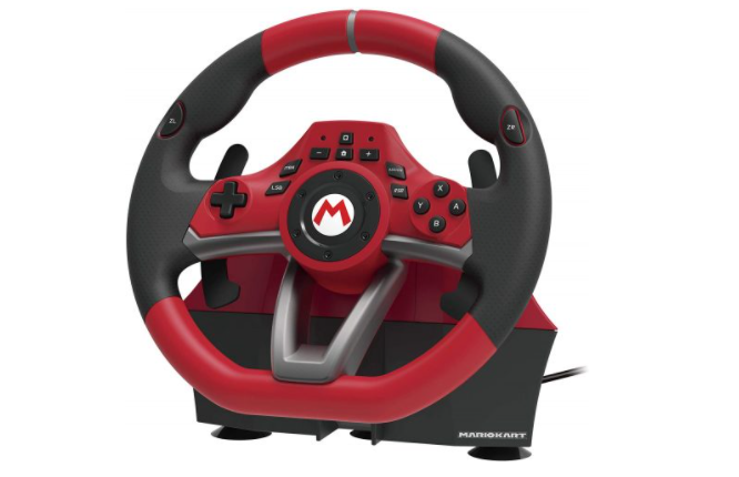 스티어링 장치와 페달이 세트로 이루어진 닌텐도스위치용 컨트롤러입니다. 일반적인 자동차 경주와 같은 직경 280mm의 사이즈를 가지고 있으며 손이 미끄러지지 않는 고무 그립도 탑재하고 있습니다.