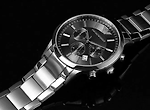 실버 스테인레스 벨트와 케이스 그리고 블랙의 문자판을 채용한 심플한 디자인의 크로노 그래프 타입 시계입니다. 광택감있는 광택 배젤이 고급스러움을 느끼게 해줍니다.